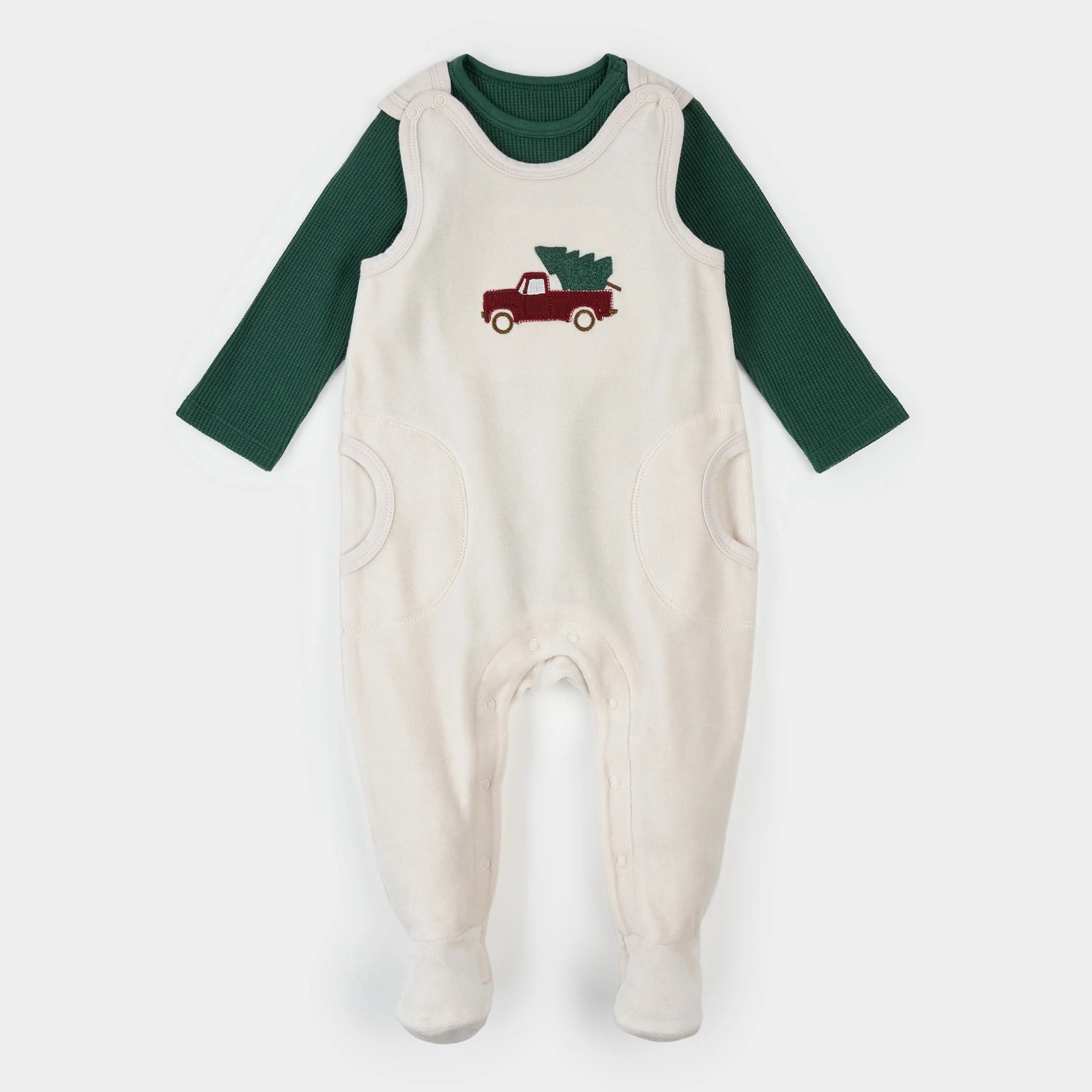 This festive set includes a thermal bodysuit and soft velour overalls with a Festive Truck motif. The overalls have a cozy fit with integrated feet and snap button straps for easy dressing.