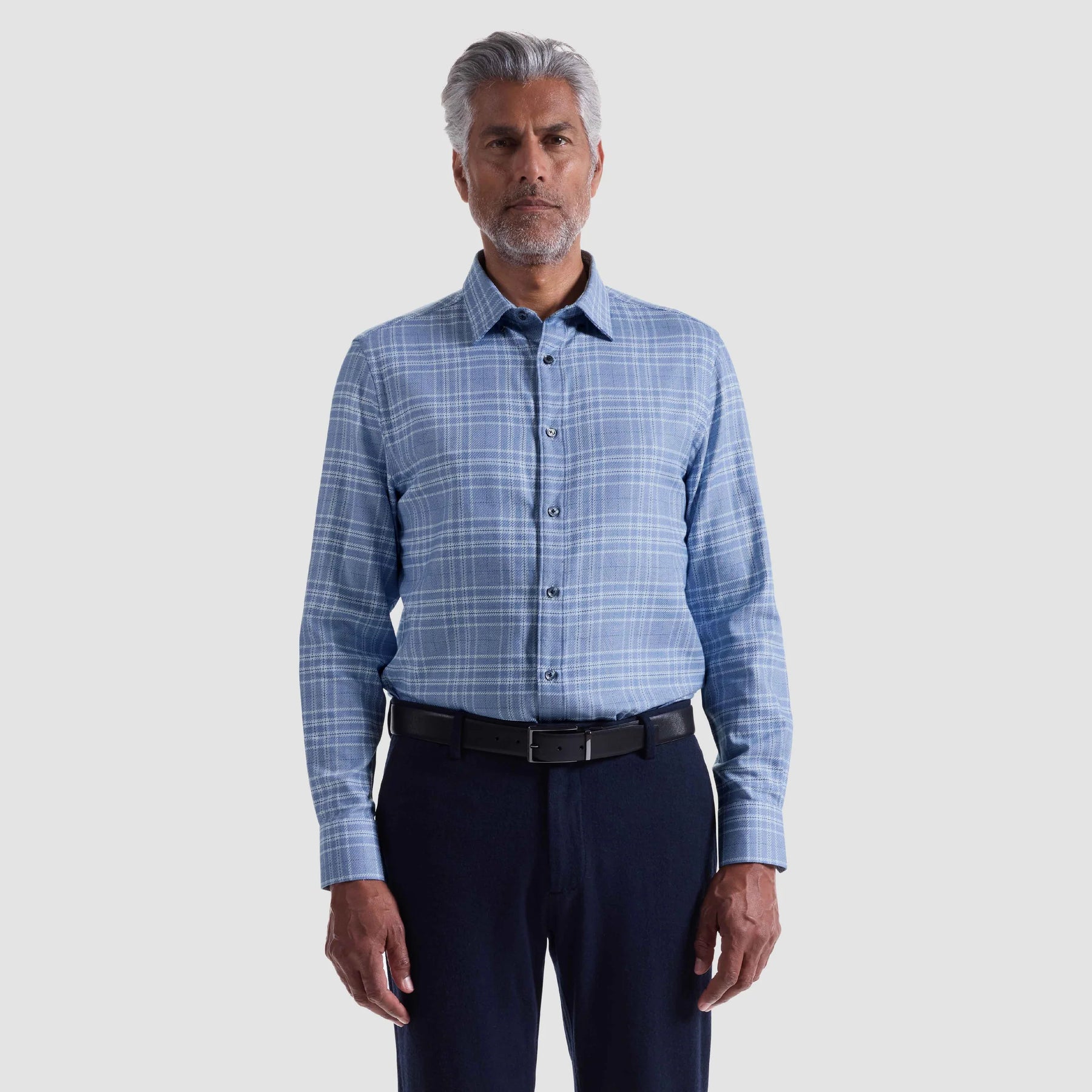 The Karl long-sleeve shirt in plaid is made in Italy from premium 100% cotton. It features a hidden button-down collar, mother-of-pearl buttons, a curved hem that looks great tucked or untucked, and adjustable notched cuffs that also convert for cufflinks. A refined, all-occasion shirt.