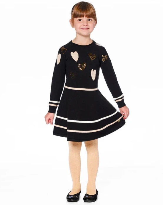 DEUX PAR DEUX- KIDS' BLACK WITH GLITTER HEART MOTIFS DRESS