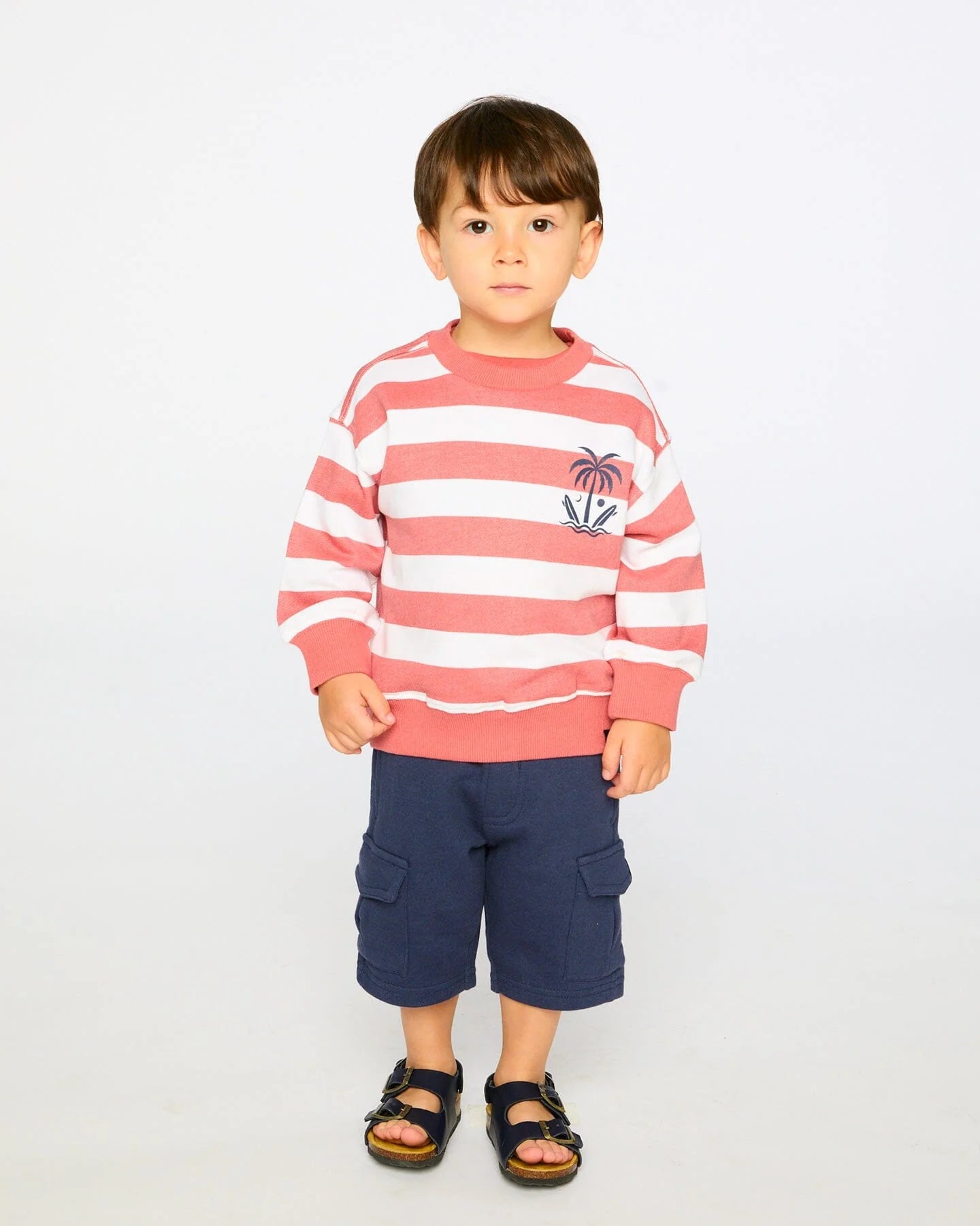 The French terry sweatshirt in brick and white stripes is a fun and casual layer for little boys. Designed with a classic crew neckline and long sleeves, this pullover features ribbed cuffs and hems, and a small graphic print on the chest of a palmtree and surfboards, evoking sunny beach days and seaside adventures. Made from a soft cotton-polyester French terry blend, this sweatshirt combines comfort and durability, perfect for everyday wear from the “Coastal Days” collection.
