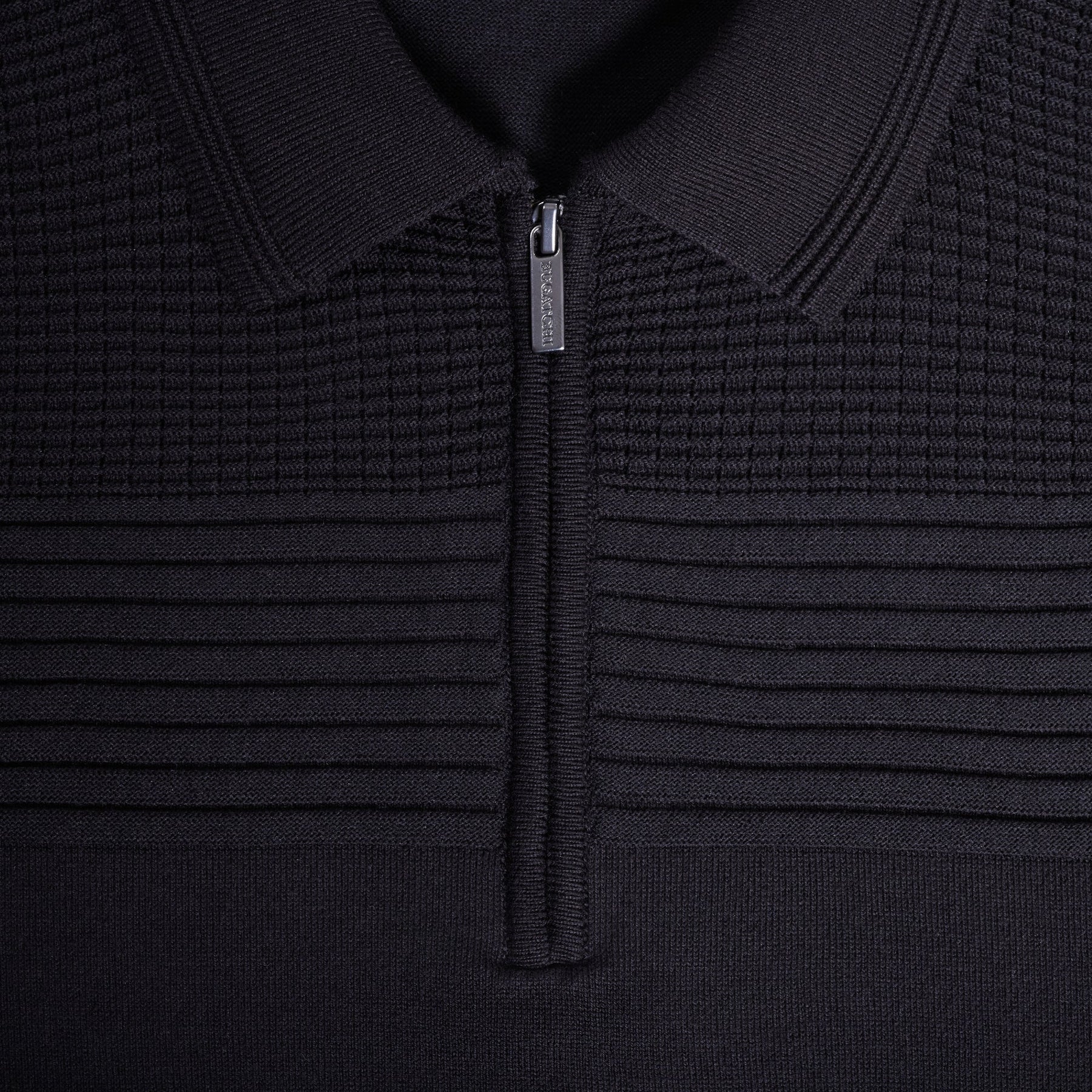 Crafted from a soft cotton blend, this short-sleeve quarter zip polo sweater features a distinctive upper chest panel in a textured waffle knit, underlined by horizontal ribbed bands for added dimension. The collar and placket are detailed with refined Ottoman stripe stitching, while ribbed cuffs and hem complete this polished, modern silhouette.