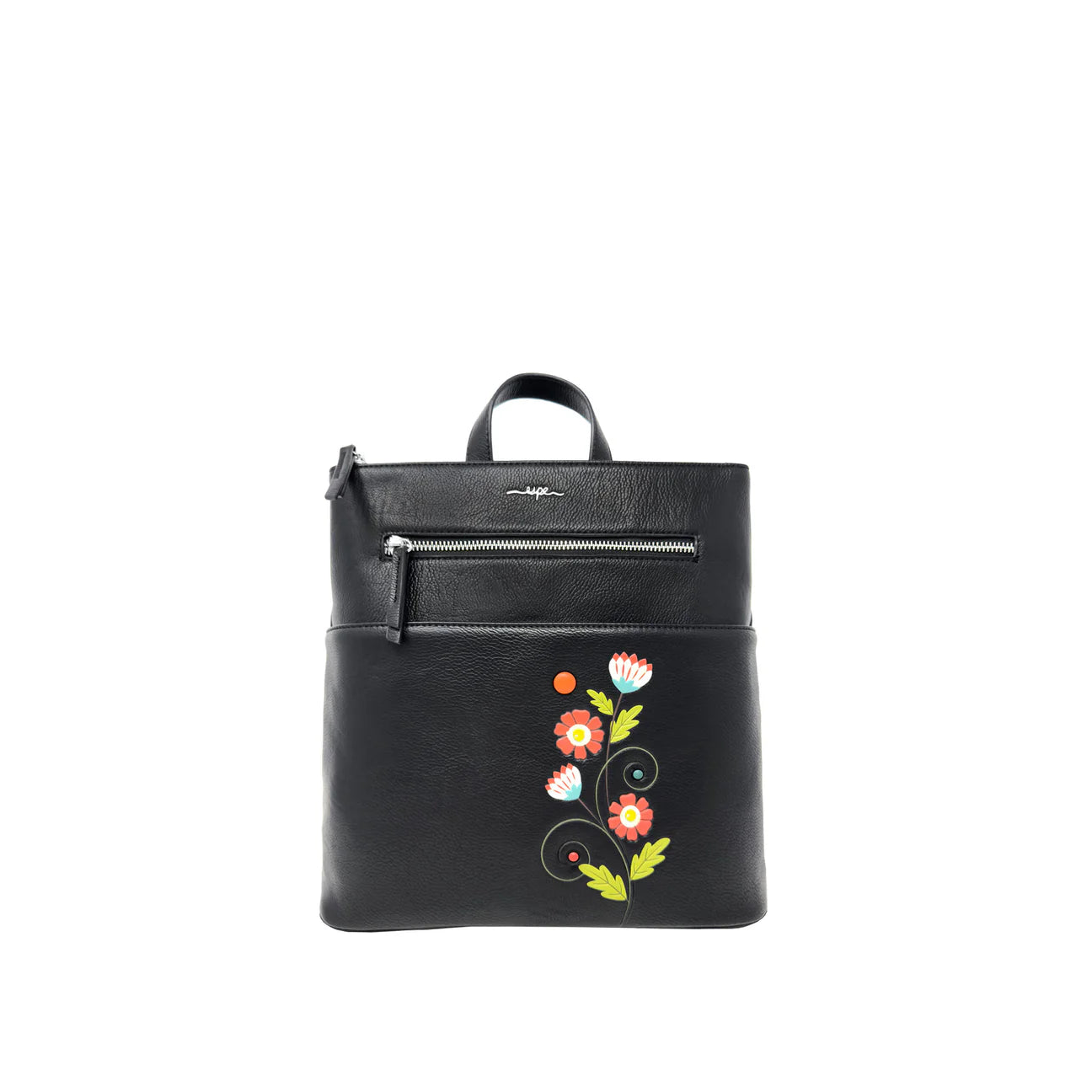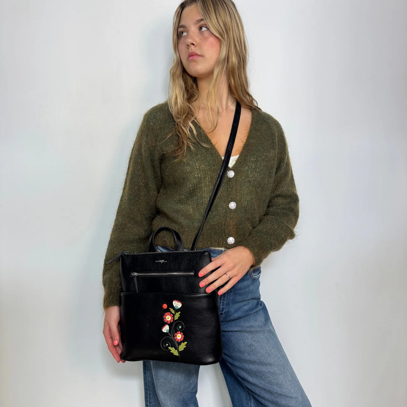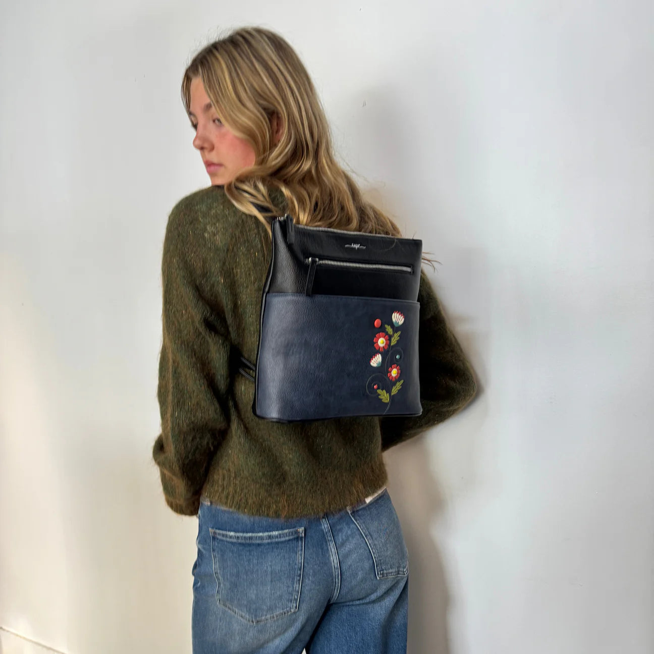 The Flora backpack transforms from stylish backpack to chic crossbody with effortless versatility. Adorned with an enchanting boho floral motif, this statement accessory infuses vibrant energy into every look. Multiple compartments and pockets ensure impeccable organization, while the delightful boho floral creates the perfect fashion-forward accent for the discerning trendsetter.