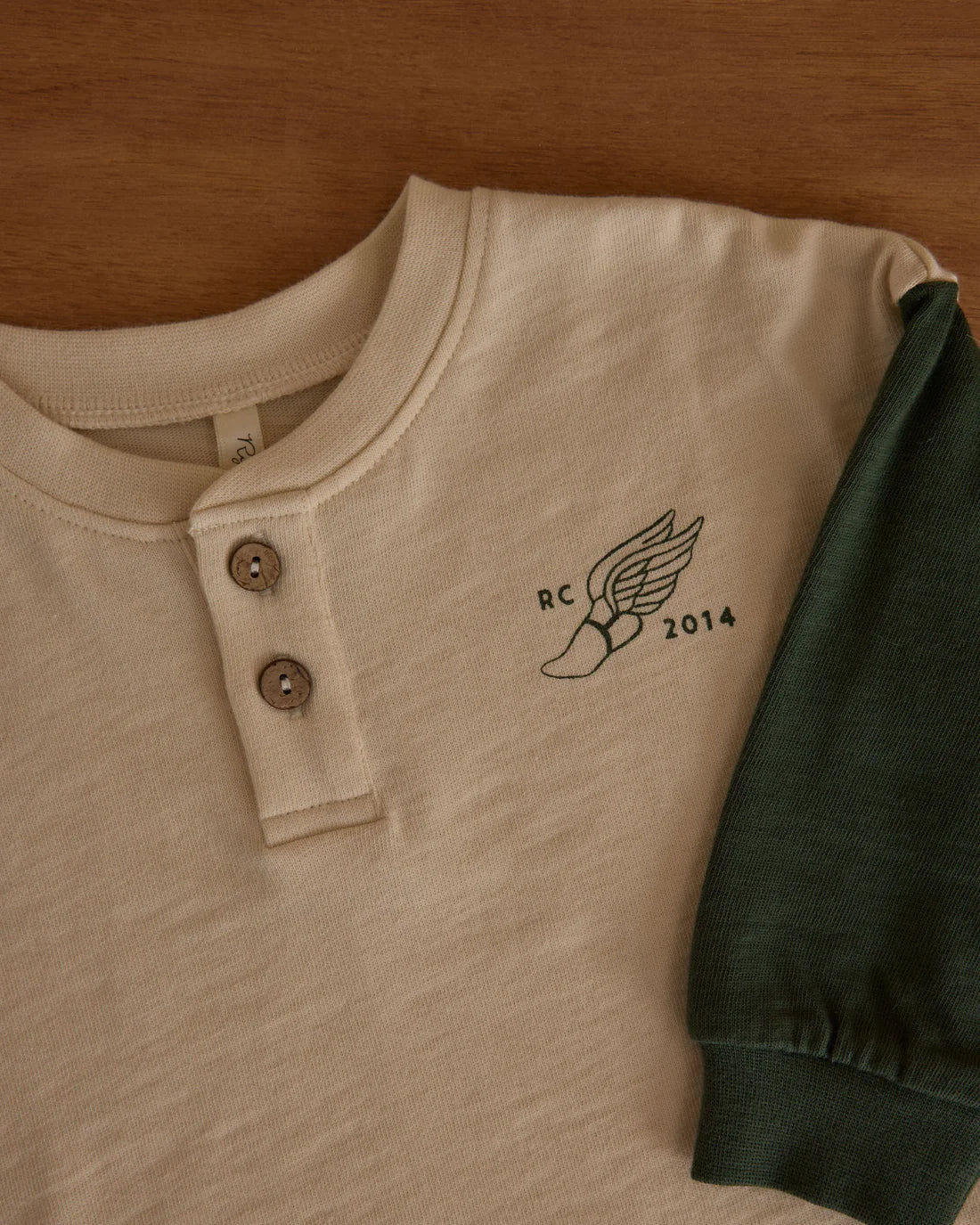 Add vintage track-and-field vibes to your wardrobe with this relaxed-fit long sleeve tee, featuring contrast sleeves and a center front button placket.