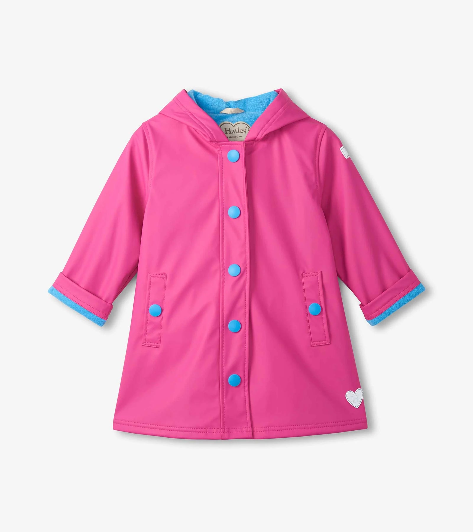 Stay dry in style with this raspberry rose rain jacket. Fully waterproof polyester construction keeps her dry through the heaviest downpours. The PVC-free materials are safe and non-toxic while the soft lining adds cozy comfort. Easy snap front with functional pockets provides practical convenience. Rainy days become exciting adventures waiting to reveal the secret design.