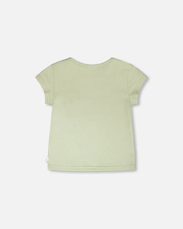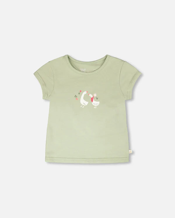 Our organic cotton jersey t-shirt in light khaki green is a sweet everyday essential with a playful twist. This top features short sleeves, a round neckline, and a front graphic of two little geese for extra charm. Soft and stretchy, it’s ideal for girls and baby girls, easy to coordinate with bottoms from our "Little Meadow" collection.