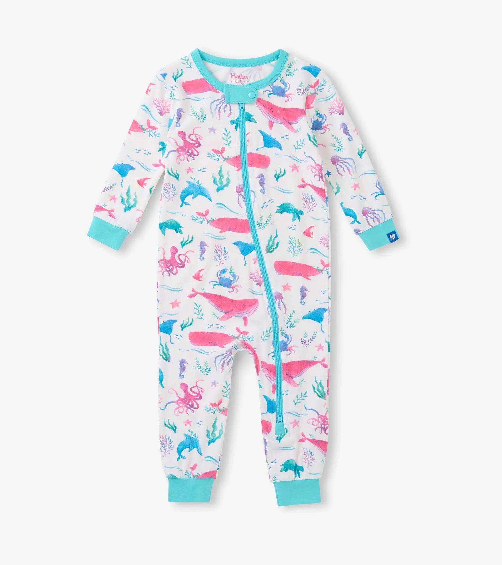 Sweet sea creatures swim across this cozy footless sleeper that's perfect for dreamtime adventures. The viscose from bamboo fabric feels incredibly soft and gentle against delicate baby skin while providing natural breathability. A full-length zipper with protective chin guard makes middle-of-the-night changes quick and comfortable. The footless design accommodates growing little feet and works perfectly in warmer weather. Snug-fit construction meets all sleepwear safety standards so parents can rest easy too.