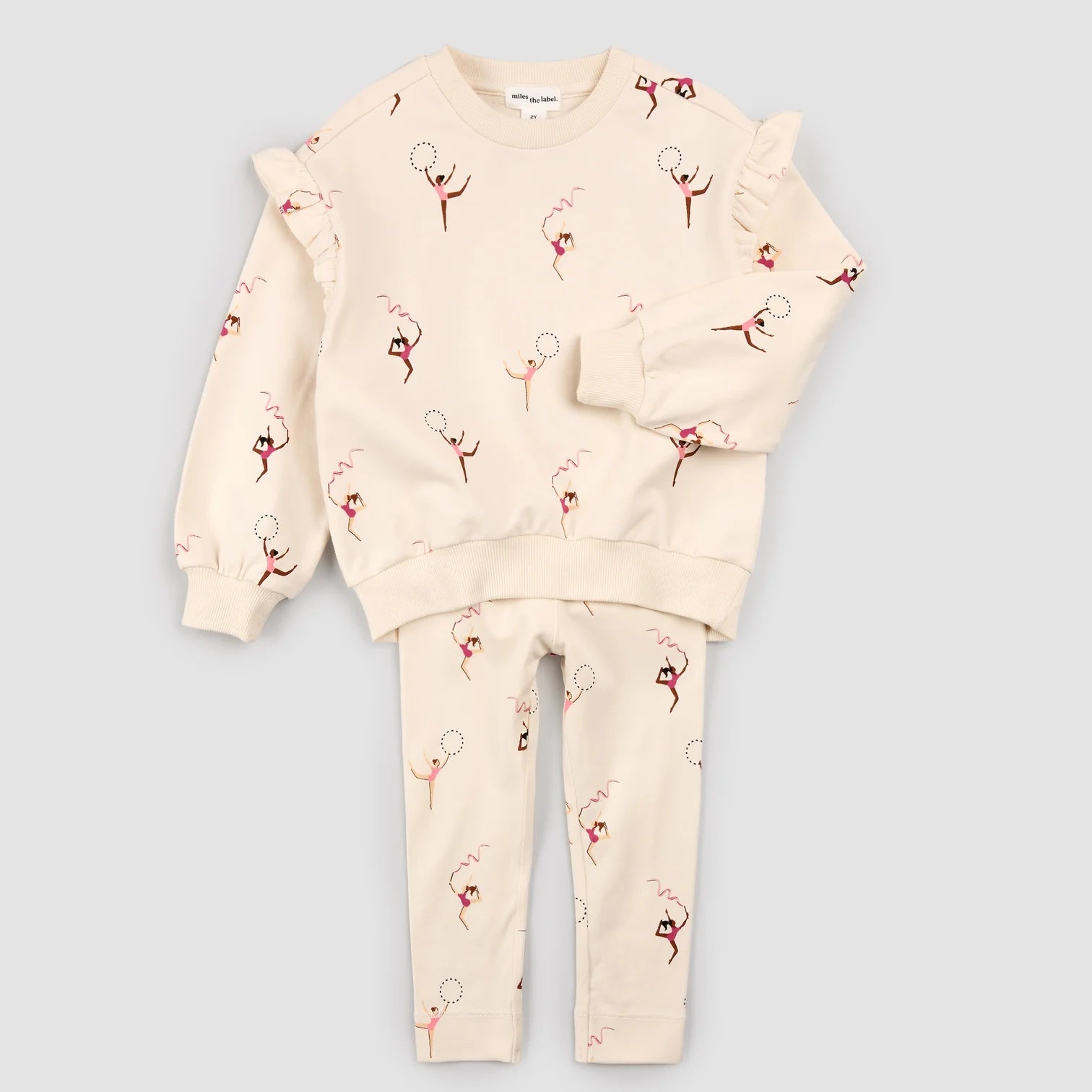 "Let her twirl, tumble, and take on the day with a spring in her step in this playful leggings set. Perfect for gymnasts in the making, it’s made from French Terry and jersey for good movement and flexibility. The slouchy sweatshirt features a sweet frill on both sides while the leggings have an elasticated waistband for fuss-free dressing and changing. There’s matching pieces for big sisters so they can play and stretch together."