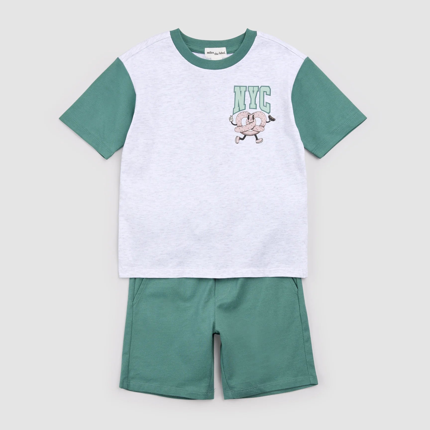 Sporty and stylish, this New York-inspired shorts set features a playful NYC pretzel graphic on the front and back. Block coloured sleeves and matching shorts provide a perfectly coordinated fit. The shorts have an elasticated waistband and it’s all made from our soft, organically grown cotton jersey for total comfort while exploring the big city or heading to the park.