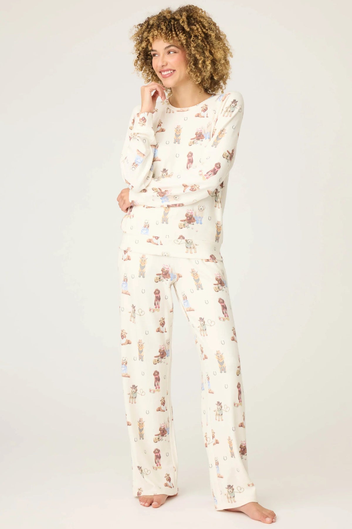 Round up some cozy charm. This ivory pajama set—crafted from soft peachy jersey—pairs a scalloped long sleeve top with relaxed drawstring pants, both in an allover western dog print with cowboy hats, boots, guitars, horseshoes, and playful pups ready for the rodeo. A perfect match for lazy mornings or curling up after sundown.