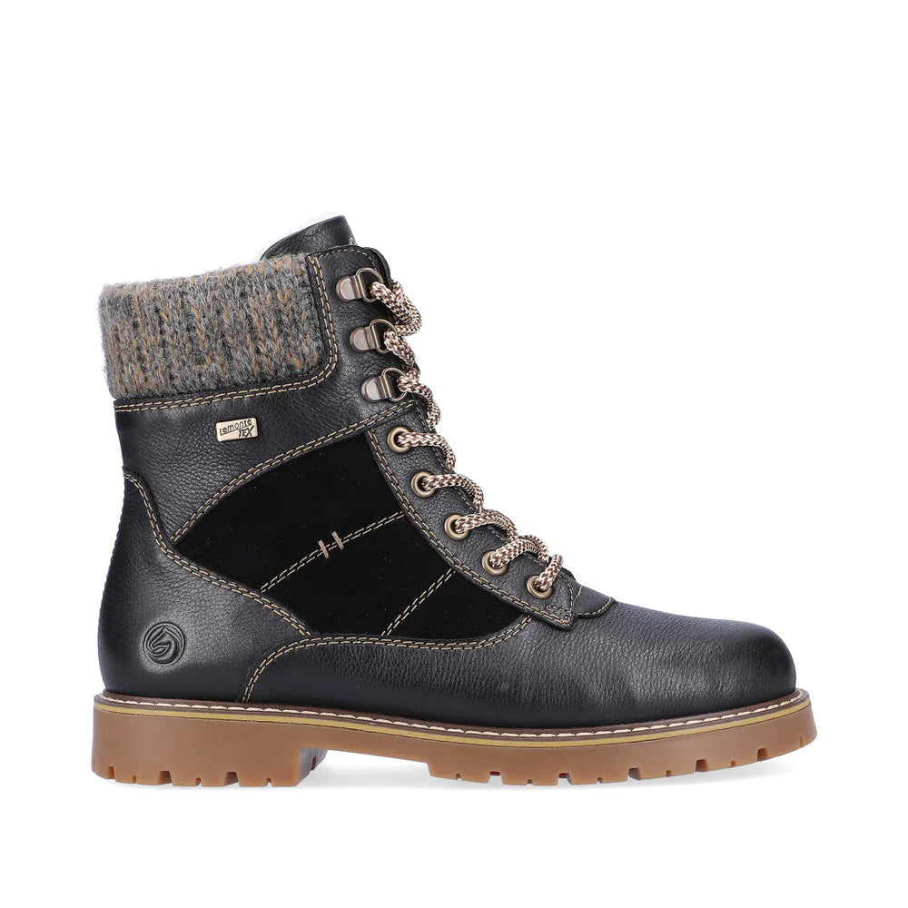 More freedom of movement for your feet! With these black remonte lace-up boots made of smooth leather you can show up anywhere! The lacing complements the zipper for functionality and comfort. The shaft collar in knit design is a real eye-catcher. The cushioning and grippy sole gives good traction at every step. The model ensures additional freedom of movement for the foot, as it is cut in comfort width. This model is all about function times three: the water-repellent membrane keeps the feet dry, the fold-out spikes can be used for extra grip on icy floors and the insole with thermo function protects against the cold. Cozy and very warm virgin wool keeps the feet warm all day long. Through the cold days with style and function!