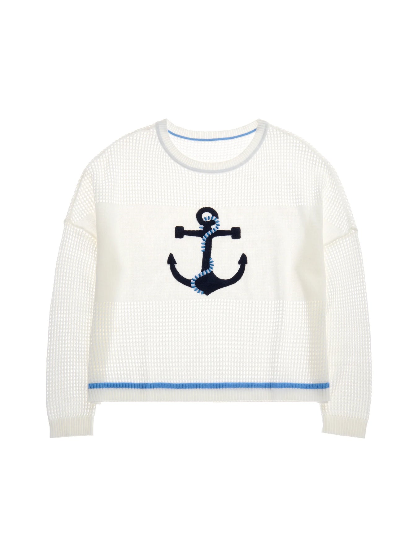 Sail into style with the Anchor Mesh Sweater, a breezy and lightweight knit that’s perfect for dockside days and sunset sails. This white open-weave pullover features a bold navy anchor motif wrapped in a striped blue rope for a playful nautical vibe. Its relaxed silhouette, ribbed trim, and pop-of-blue hemline detail add a polished finish to its airy feel. Whether you're layering it over a tank or tossing it on post-swim, this sweater brings effortless charm to your coastal wardrobe.