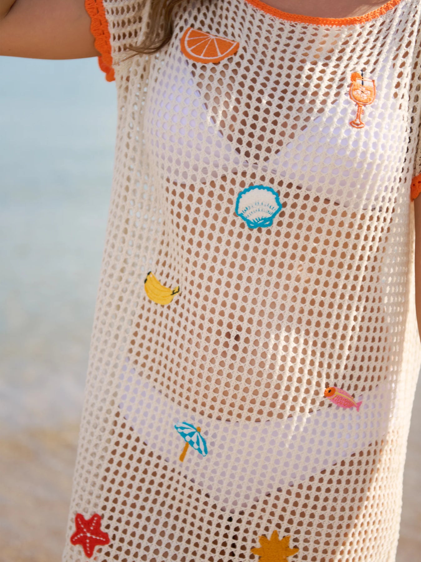 Make a splash this season with the Lalita Cover-Up, a playful mesh dress embroidered with tropical motifs like sunbursts, citrus slices, seashells, and fruity cocktails. Crafted from a breathable open-weave fabric, it’s the perfect piece to throw on over your swimsuit for poolside lounging or seaside strolls. The bright orange trim adds a bold pop of color while the relaxed fit keeps things effortlessly breezy. Whether you're chasing sunsets or just your next piña colada, this cover-up has you covered.