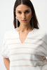 Introducing the Joseph Ribkoff pullover, a perfect blend of style and comfort. This hip-length, relaxed fit piece features a chic V-neck and eye-catching stripes, ideal for casual summer days. The short, drop-sleeve design offers a minimalistic yet fashionable look. Lightweight and effortlessly stylish, this pullover is a must-have for any wardrobe.