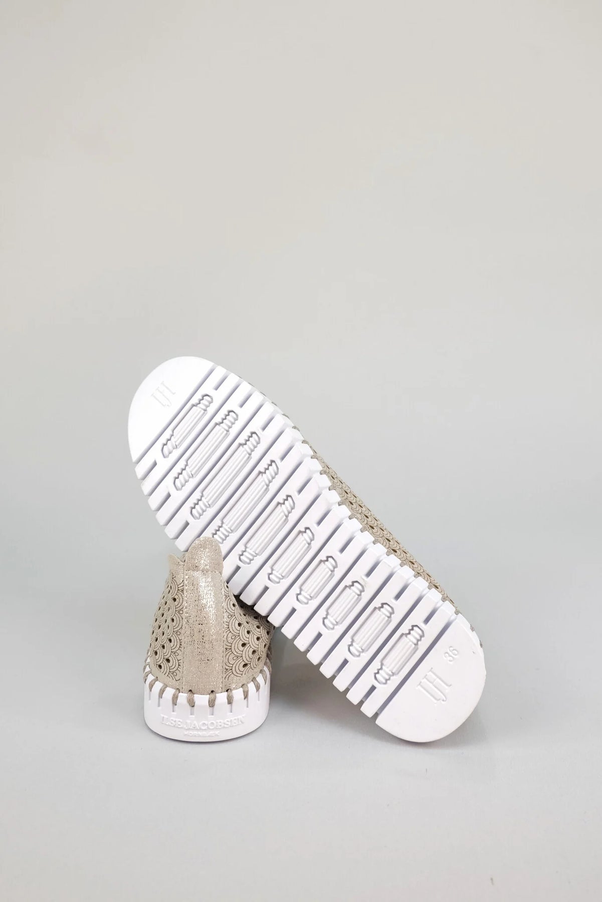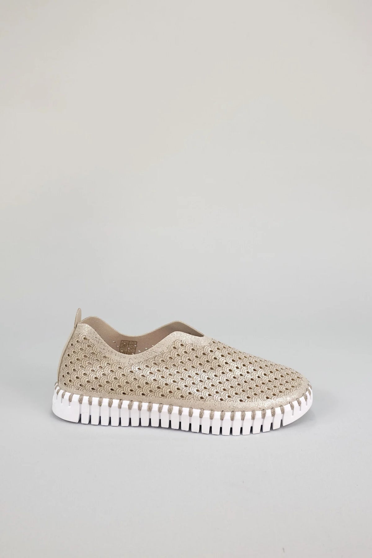 Lightweight and cushioned slip on metallic shoe with perforated water-friendly recycled microfibre upper and a flexible natural rubber sole with whipstitched detailing.
