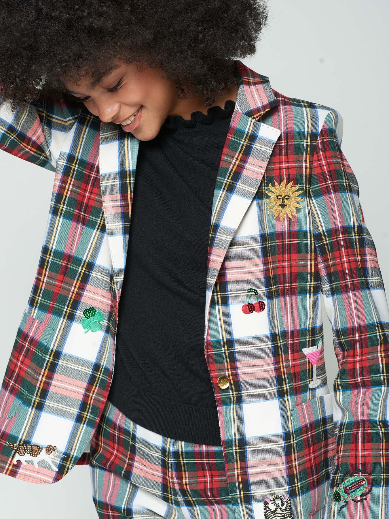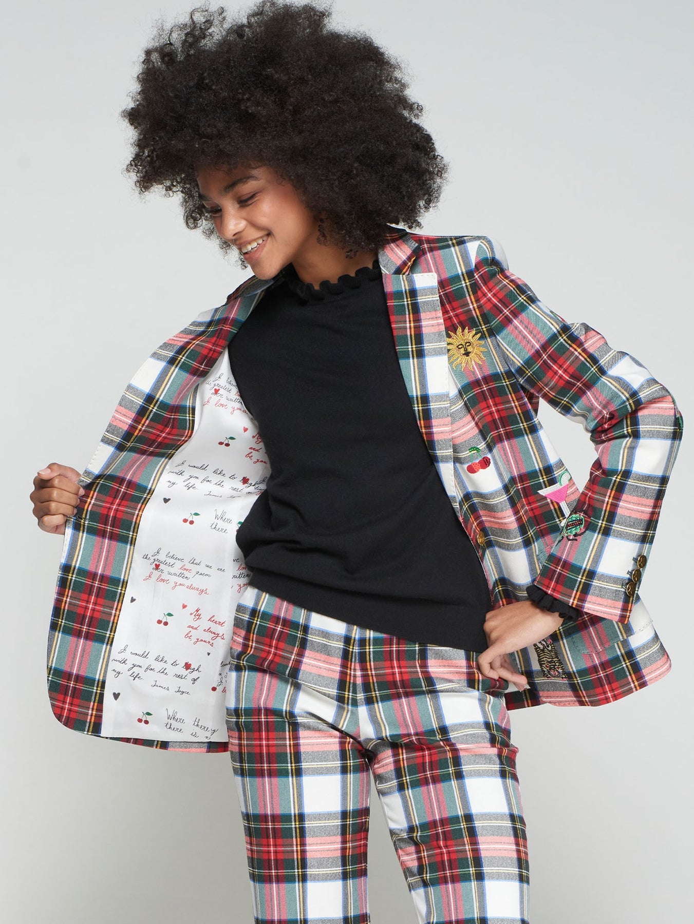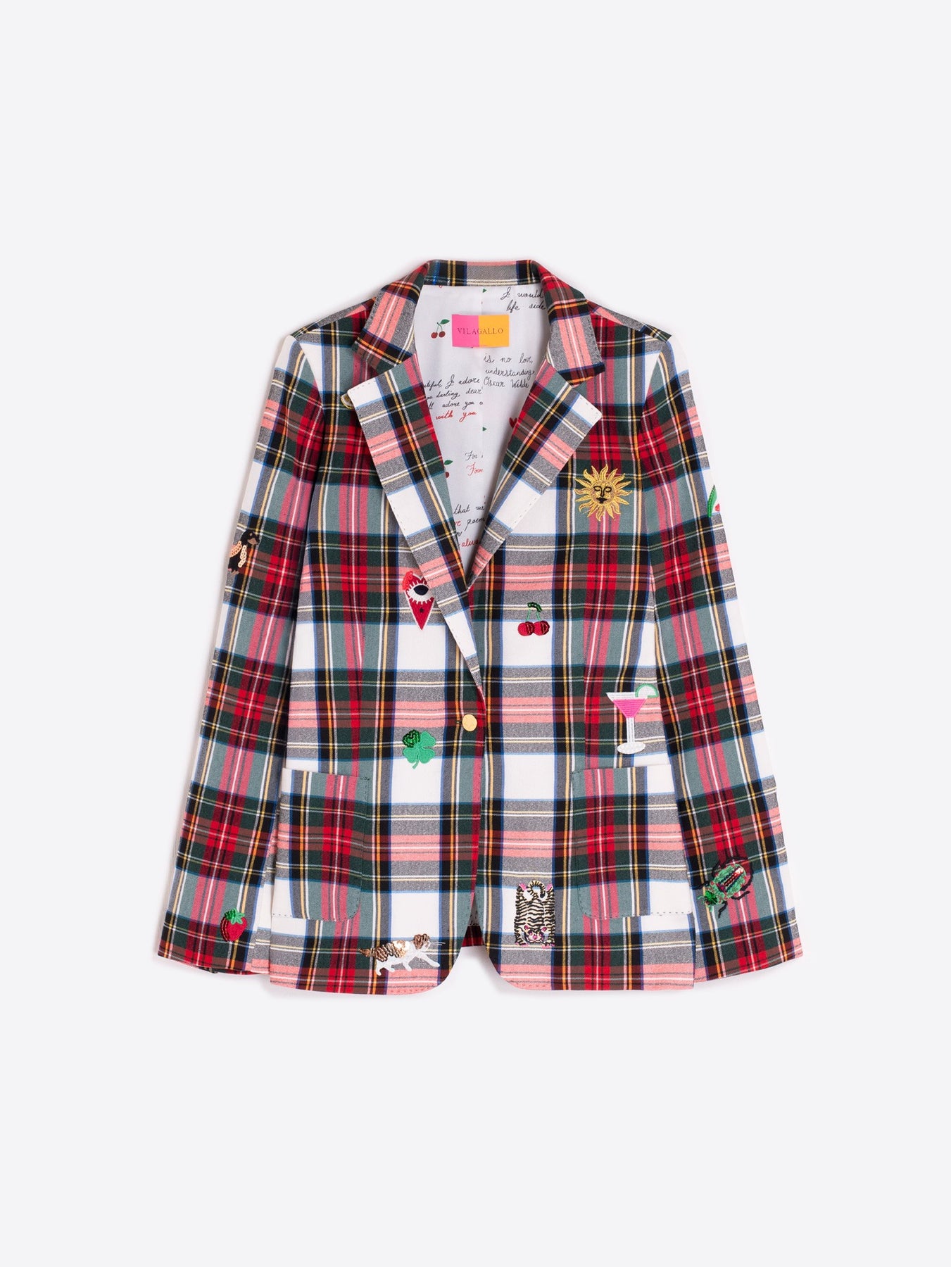 Tartan jacket in red, beige and green tones with detailed embroidery of insects, cherries and symbols. Straight cut with classic lapel and gold button closure. Features front patch pockets. The interior is finished with a printed lining. Designed as part of a coordinated set with matching trousers.