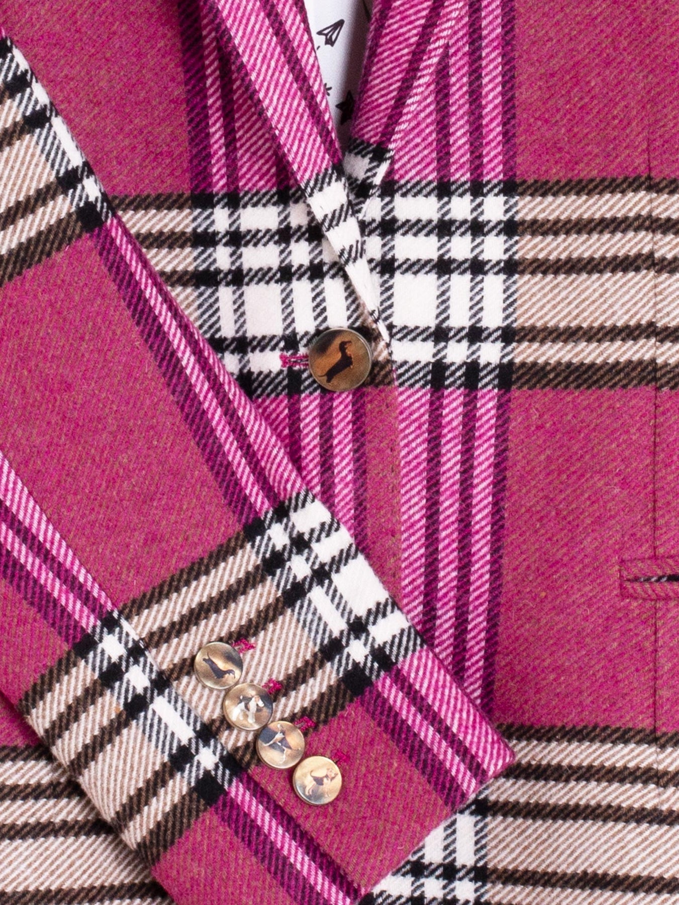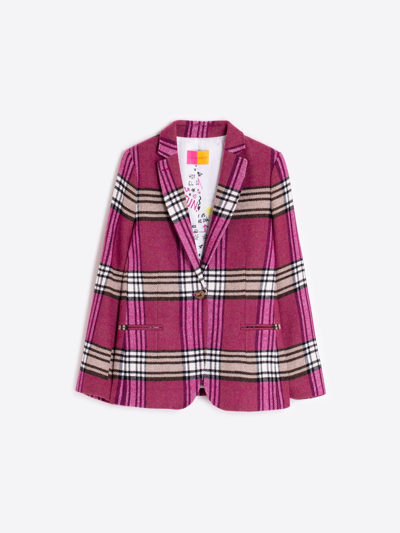 Blazer in raspberry and beige checks with black and white lines. Straight cut with classic lapel collar and a single front button featuring a dog silhouette. Three contrast buttons on each cuff. Printed inner lining with graphic motifs. Wool blend fabric for autumn-winter.