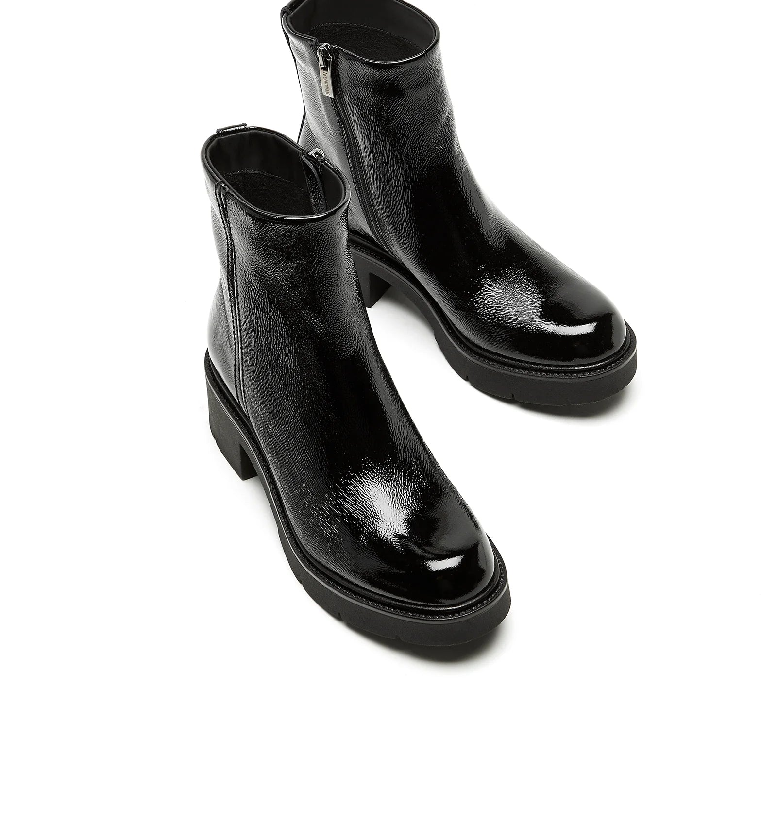 This ankle boot features a sleek rounded toe and an interior side zipper, set on a sturdy block heel with a treaded sole for confident, all-day wear.