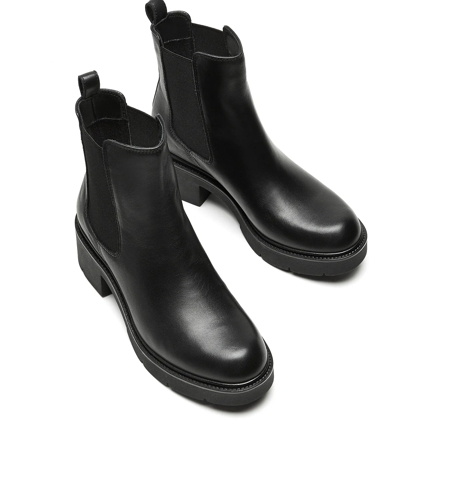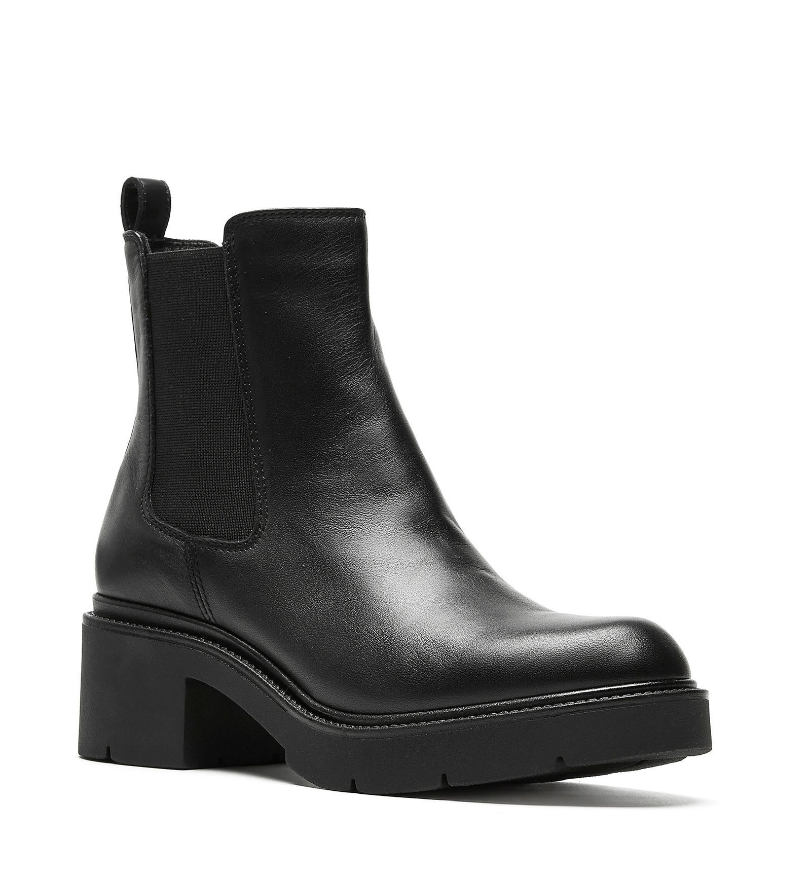 A polished leather Chelsea boot featuring elastic side panels for easy slip-on access. Balanced on a block heel with a treaded sole for grip, support, and versatile styling.