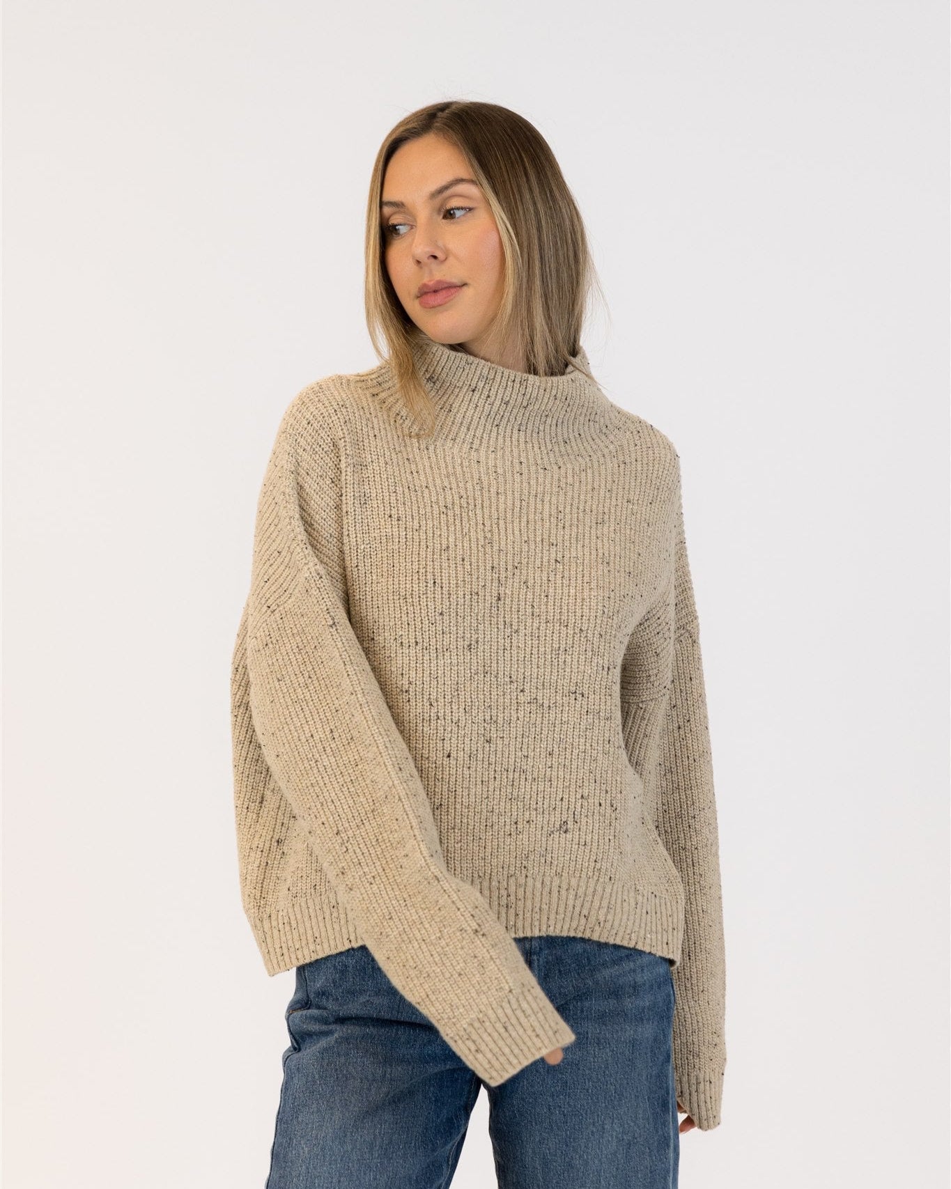 "Cozy texture meets timeless style in the Lyla + Luxe Evolet Fleck Sweater. This mock-neck pullover is crafted from a soft, chunky ribbed knit in a warm neutral tone, accented with subtle flecking for a rustic yet refined look. Designed with a relaxed, boxy silhouette and drop shoulders, it’s the perfect blend of laid-back comfort and modern polish."