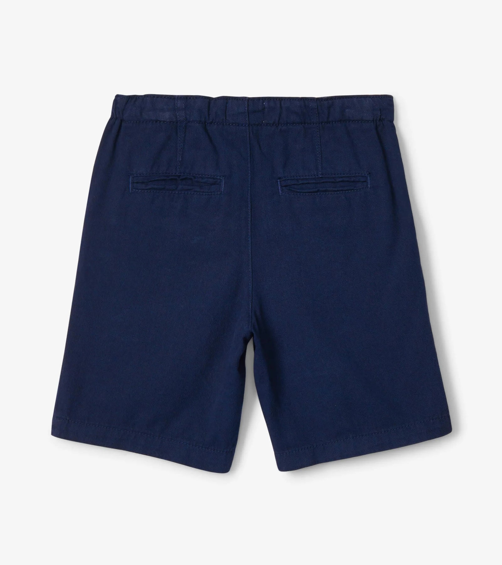 Classic navy twill shorts with real zipper and button closure let him feel like one of the big kids. Durable cotton construction stands up to playground adventures while maintaining a polished appearance for special occasions. The adjustable waist ensures a proper fit as he grows, and functional front pockets store essentials. Perfect for everything from family photos to backyard explorations without compromising on comfort. A timeless wardrobe staple that pairs perfectly with any shirt in his closet.