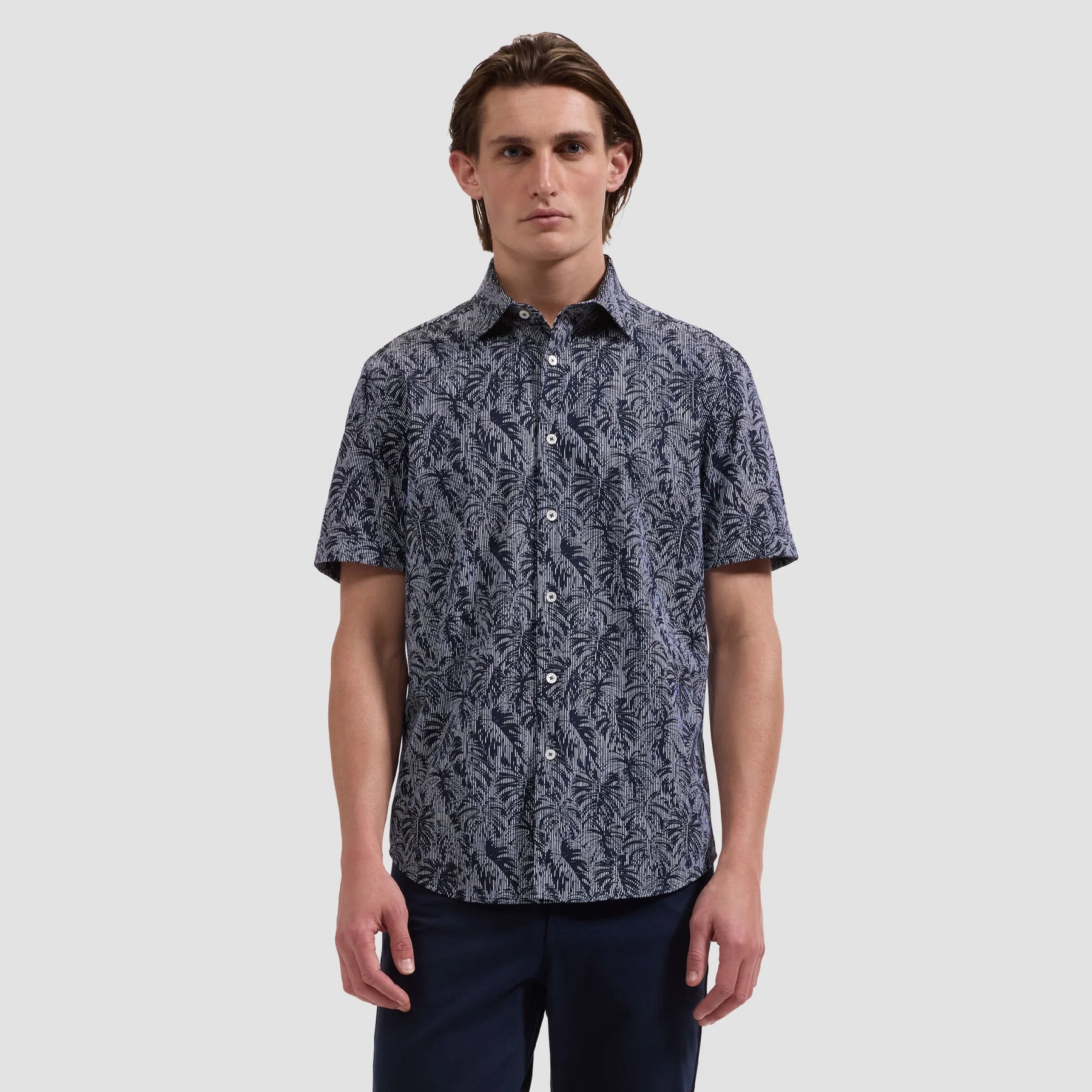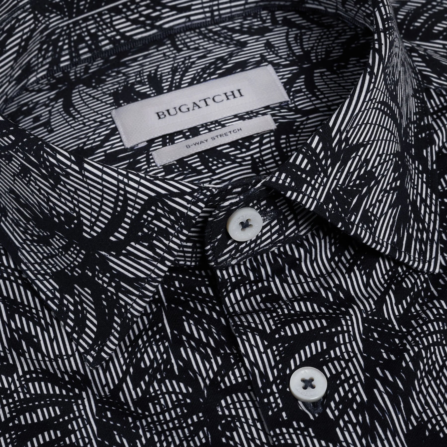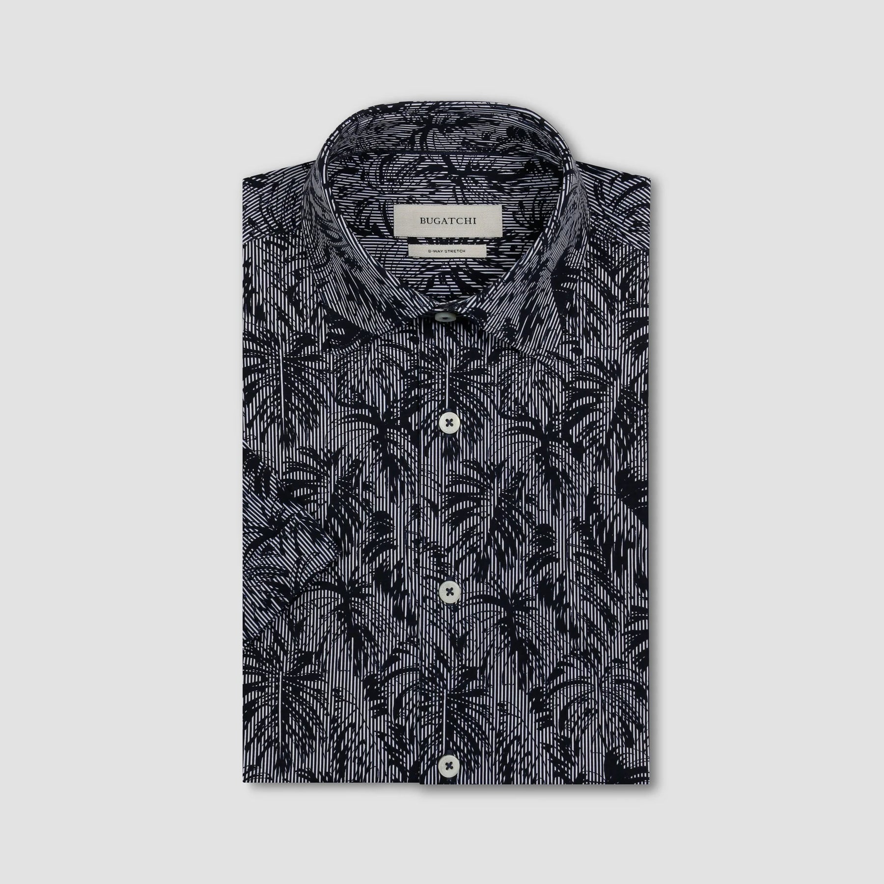 The Miles OoohCotton® short-sleeve shirt offers versatile comfort for warmer days with a striped leaf print, point collar, genuine mother-of-pearl buttons, and a curved hem for a polished tucked or untucked look. Made from our signature OoohCotton® double-mercerized performance fabric with 8-way stretch, moisture-wicking, quick-dry, wrinkle-resistant, and thermal comfort properties.