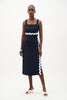 Introducing the Joseph Ribkoff A-line Midi Dress, a perfect blend of casual and semi-formal elegance. Featuring a flattering square-neck and a chic side slit, this sleeveless dress showcases a plain, feminine style. Ideal for various occasions, it effortlessly combines comfort and sophistication, making it a versatile addition to your wardrobe.