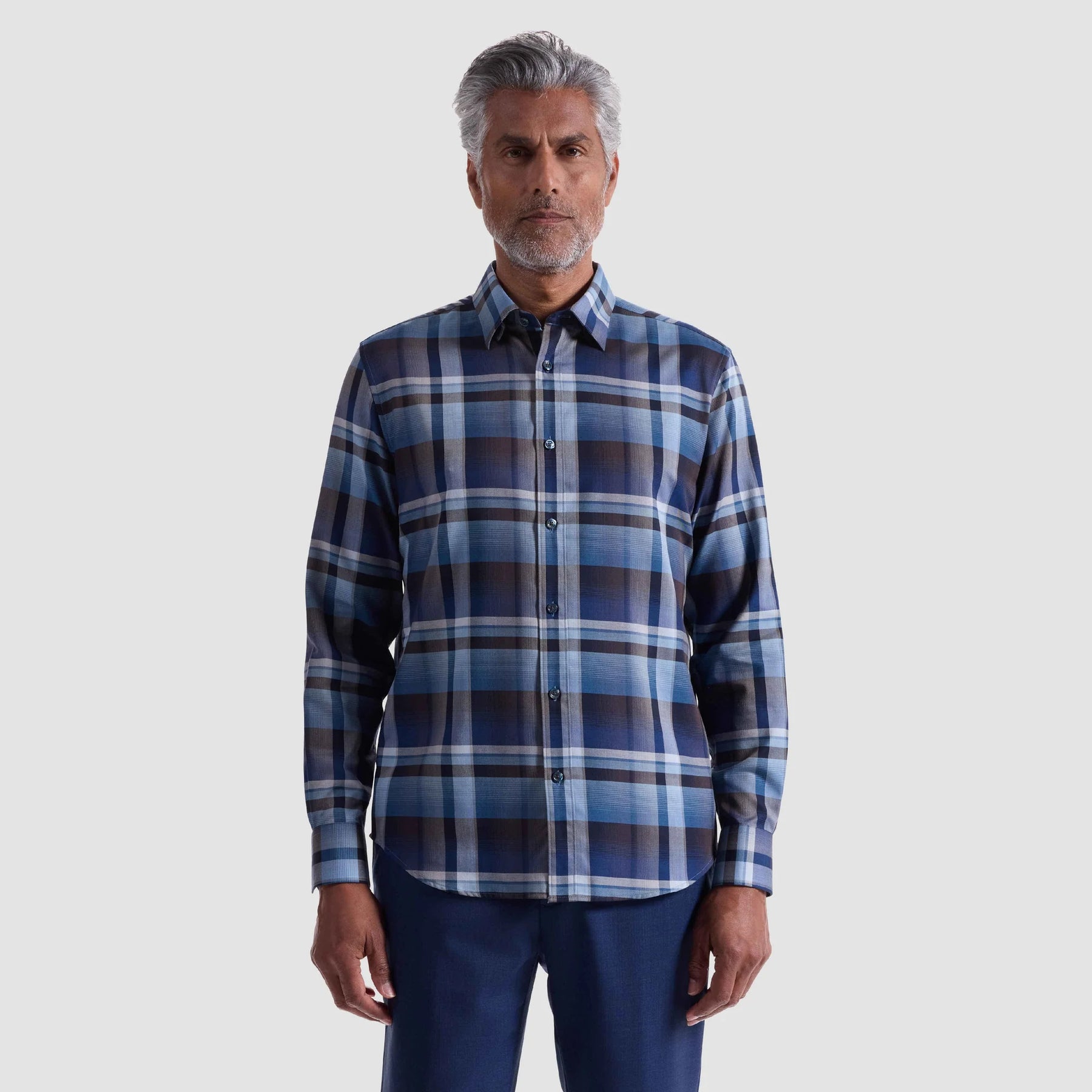 The Karl long-sleeve shirt in plaid is crafted from a premium blend of cotton and cashmere. It features a hidden button-down collar, mother-of-pearl buttons, a curved hem that looks great tucked or untucked, and adjustable notched cuffs that also convert for cufflinks. A refined, all-occasion shirt.