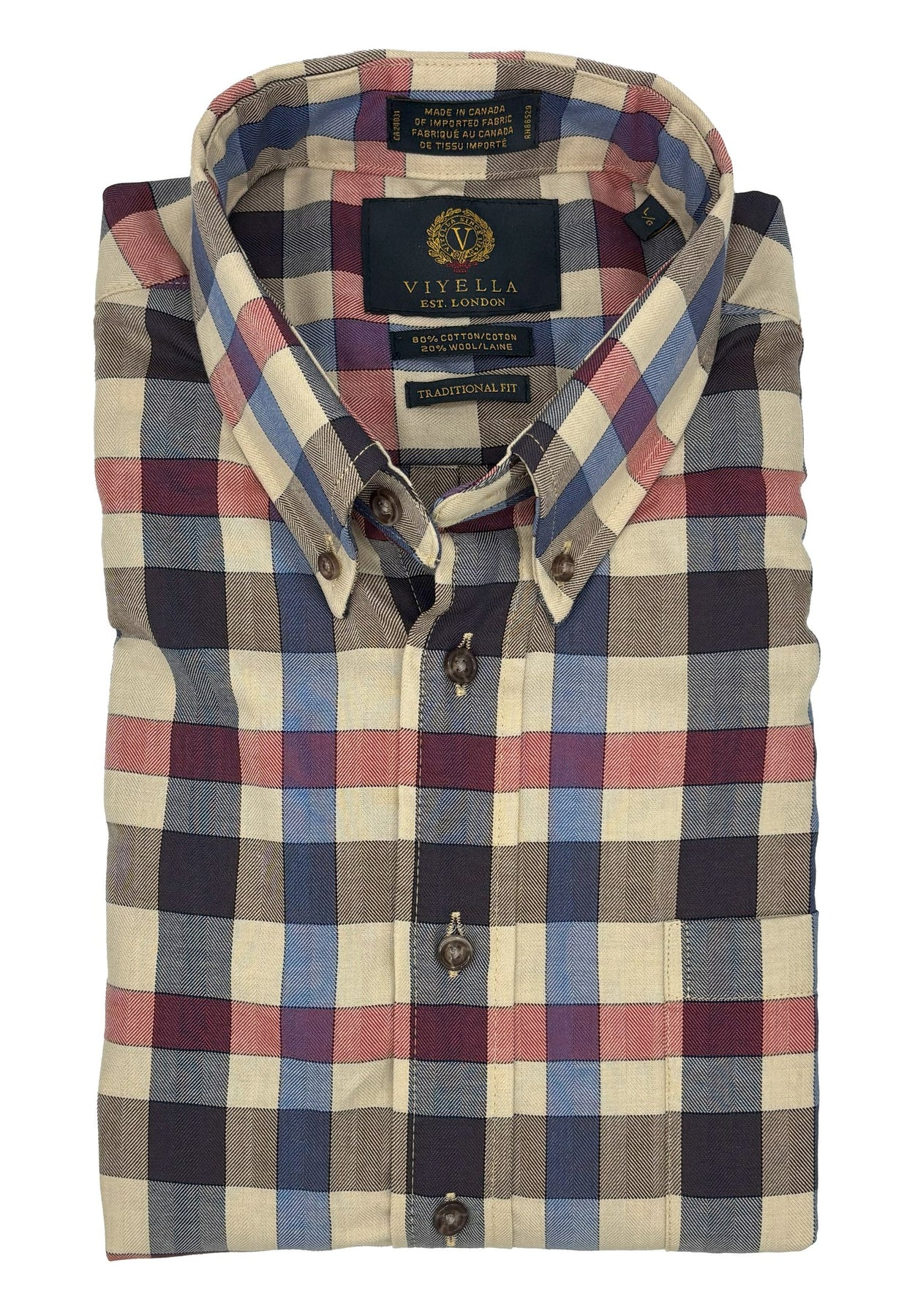 Since 1784, Viyella has manufactured the finest natural fabrics. This long-sleeved check pattern shirt is made in Canada with 80% cotton and 20% Merino Wool, allowing for warmth and breathability. The adjustable cuff, button down collar and chest pocket make this a versatile shirt for any occasion. Traditional Fit