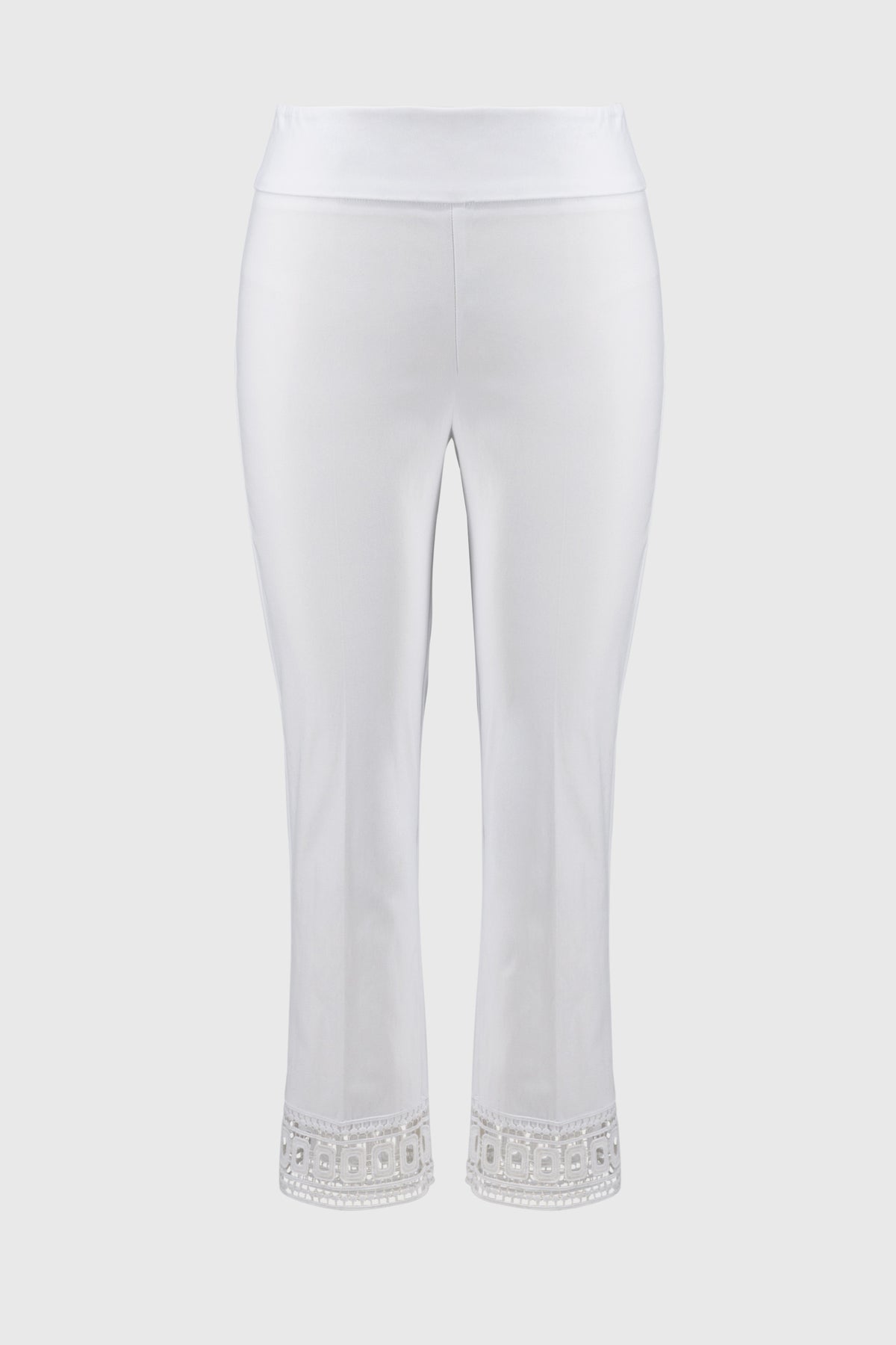 Discover the perfect blend of comfort and style with Joseph Ribkoff's high-waisted trousers. These slim-fit, cropped bottoms feature elegant embroidery and an elastic waistband, making them ideal for casual summer occasions. The plain pattern and feminine design ensure a timeless look that effortlessly complements your wardrobe. Experience unparalleled sophistication and ease with these must-have trousers.