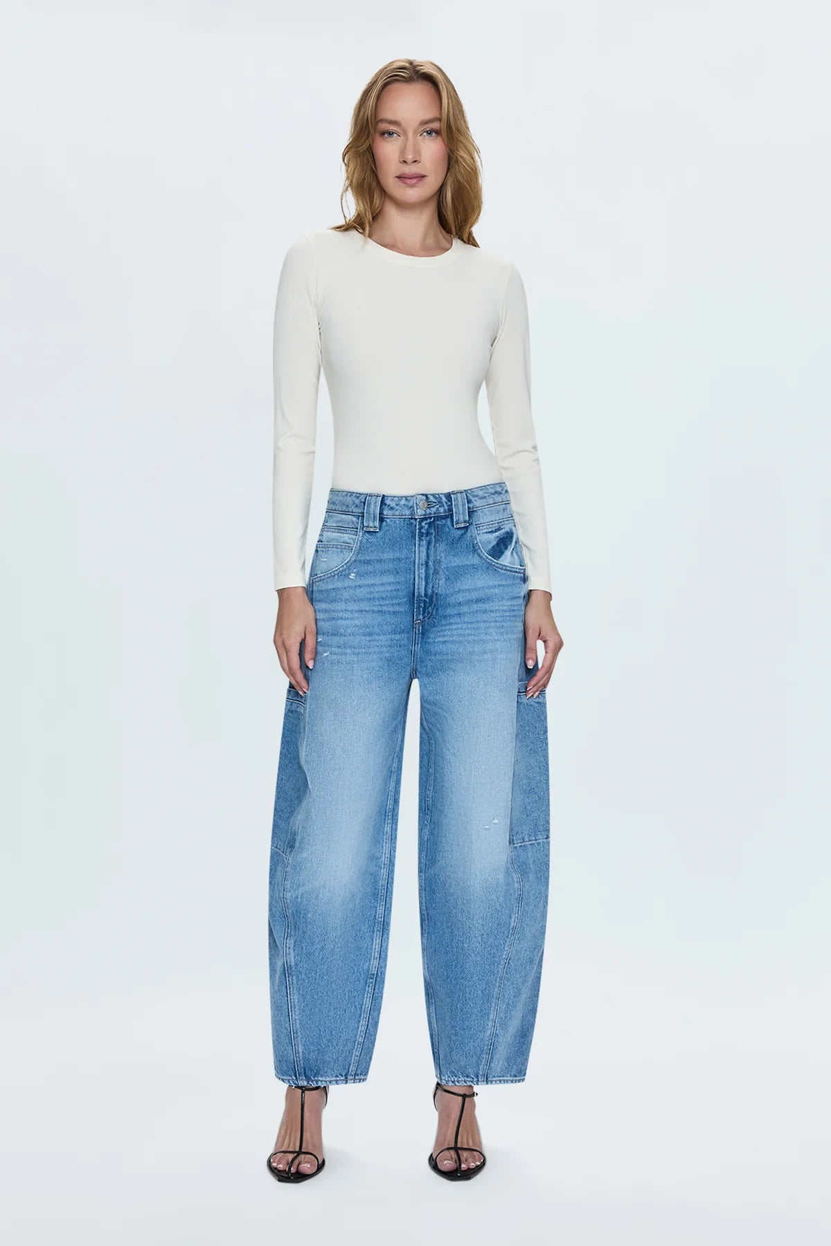 Super high rise waist that falls into a wide leg, exaggerated balloon fit with a tapered 27" hem length. Crafted from rigid non-stretch denim for an expert fit that holds its shape. Paneled side seaming with oversized pockets for a utility inspired finish. Freestyle is a medium blue wash with moderate fading and clean finishes.