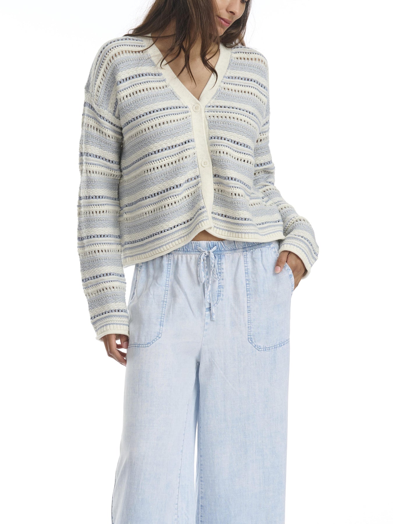 We made a beach day into a cardigan. With its airy knit and coastal-inspired stripes, this cardigan is the perfect warm weather layer.