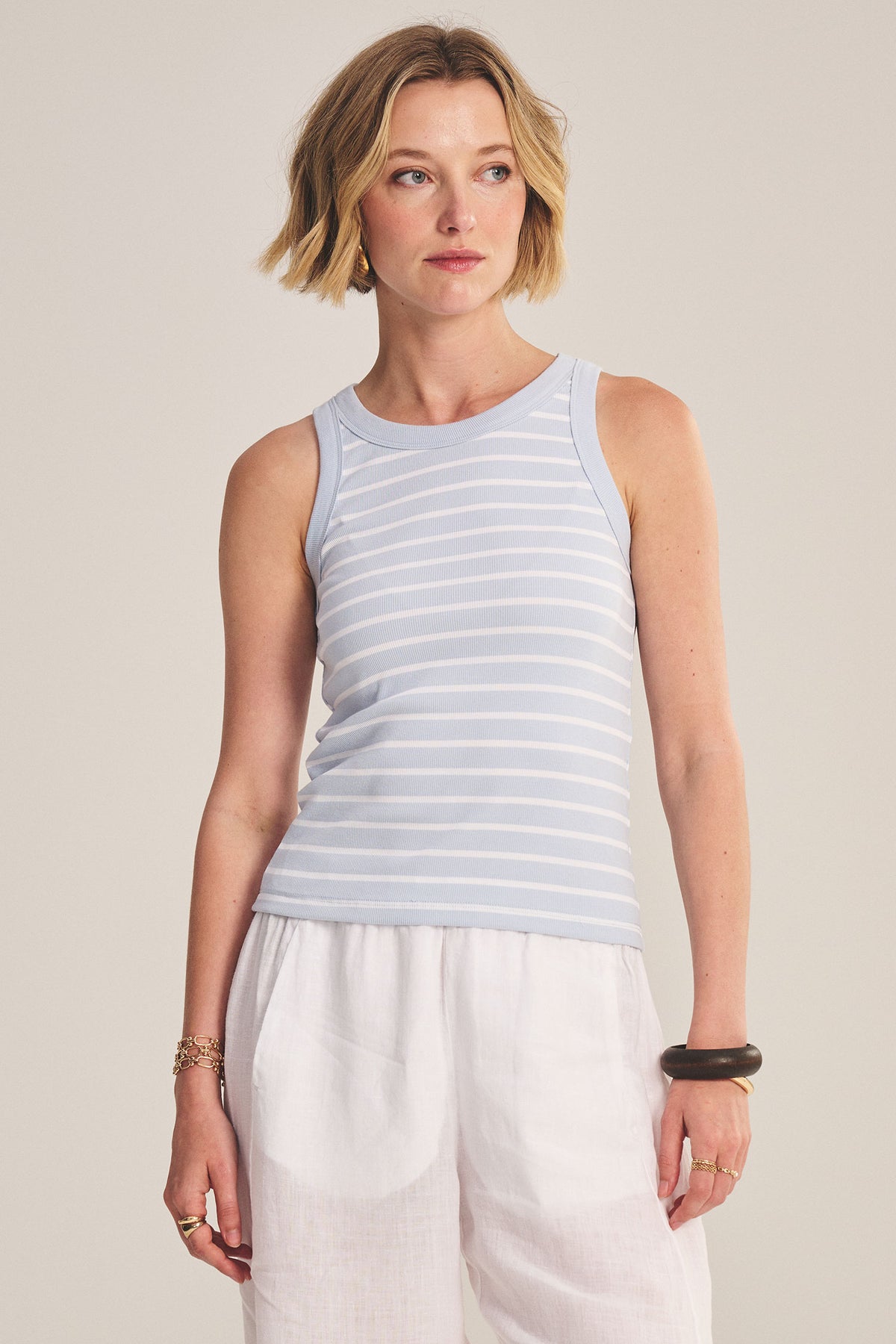 Simplicity meets sophistication in this essential tank top designed for year-round versatility. The mixed-media construction combines ribbed and poplin fabrics, creating subtle texture and dimension that elevates a basic silhouette into something truly special. Perfect as a standalone piece or layered under your favorite cardigan or jacket, this tank adapts to any season and occasion. The crew neckline and sleek fit flatter every frame while the premium fabric blend ensures lasting comfort and durability. Whether you're building a capsule wardrobe or refreshing your basics collection, this timeless tank delivers effortless style that works as hard as you do.