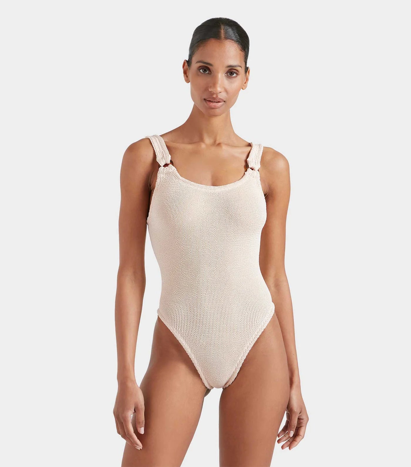Domino Swimsuit - Some things never get old. Noughties tortoiseshell accents and a dipped neck silhouette and low scooped back – rule the beach in this iconic swimsuit