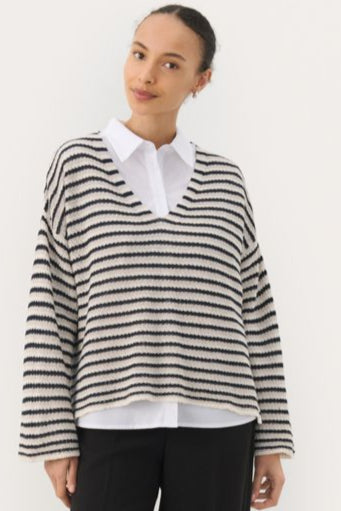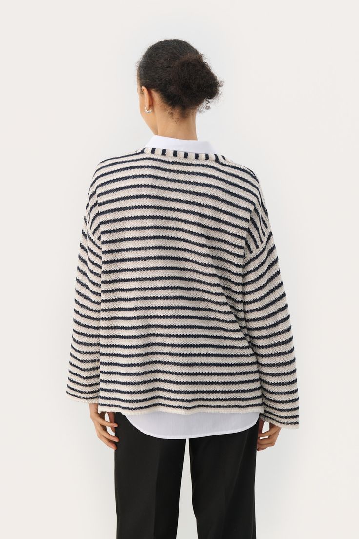 "The model is 180 cm tall and is wearing a size M. This striped knit sweater in red and white combines a relaxed fit with a flattering V-neckline. The lightweight material makes it perfect for both everyday wear and weekends. Pair it with loose trousers for a fresh and summery look."