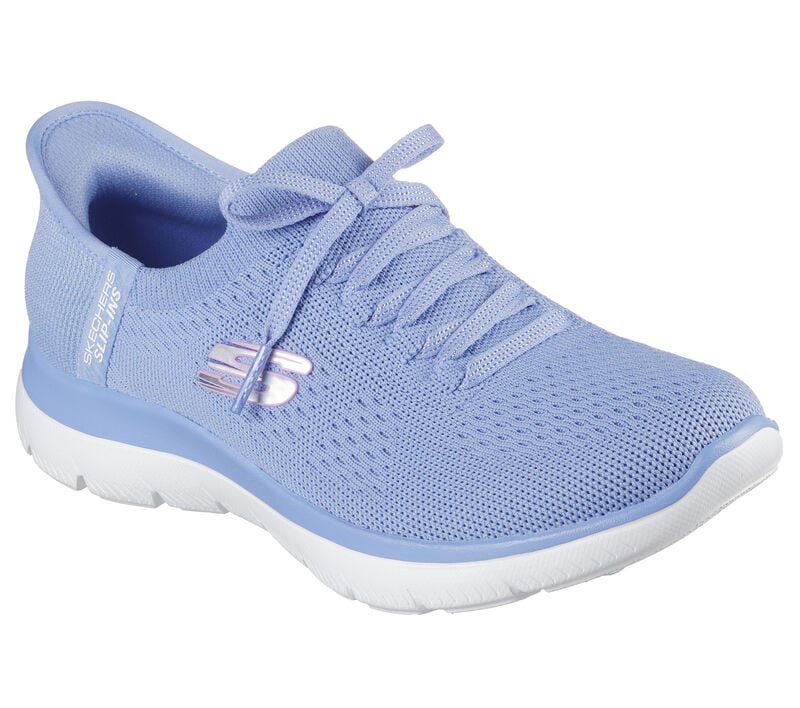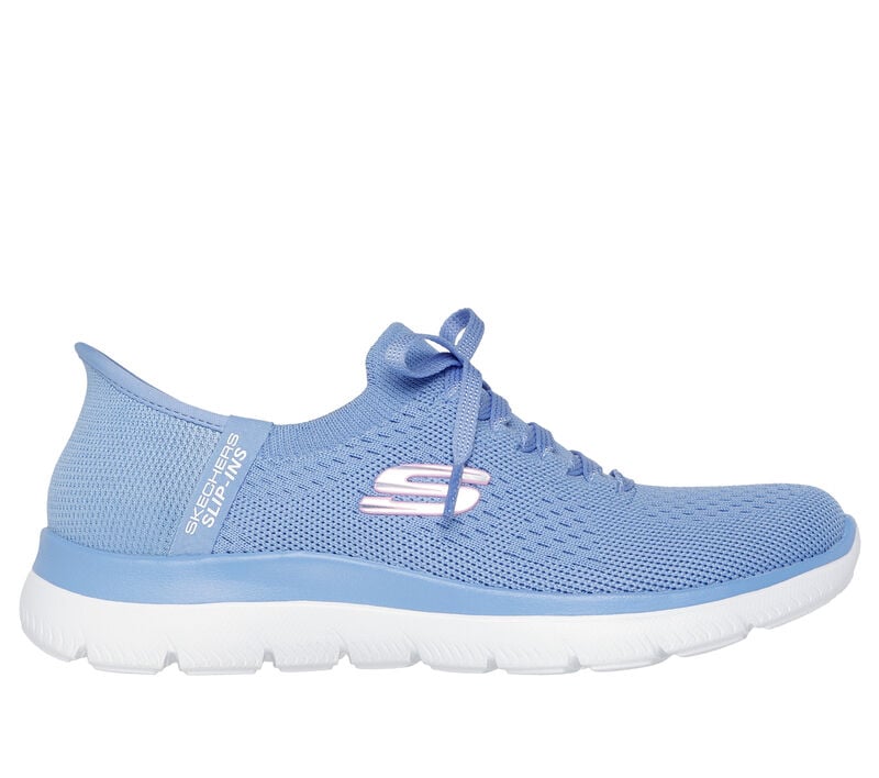 "Pick up the pace with increased ease-of-wear and platinum comfort wearing Skechers Hands Free Slip-ins®: Summits - New Daily. Designed with our exclusive Heel Pillow™, this vegan style features a Stretch Fit® engineered knit upper with fixed laces, metallic midsole trim and a cushioned Skechers Air-Cooled Memory Foam® comfort insole."