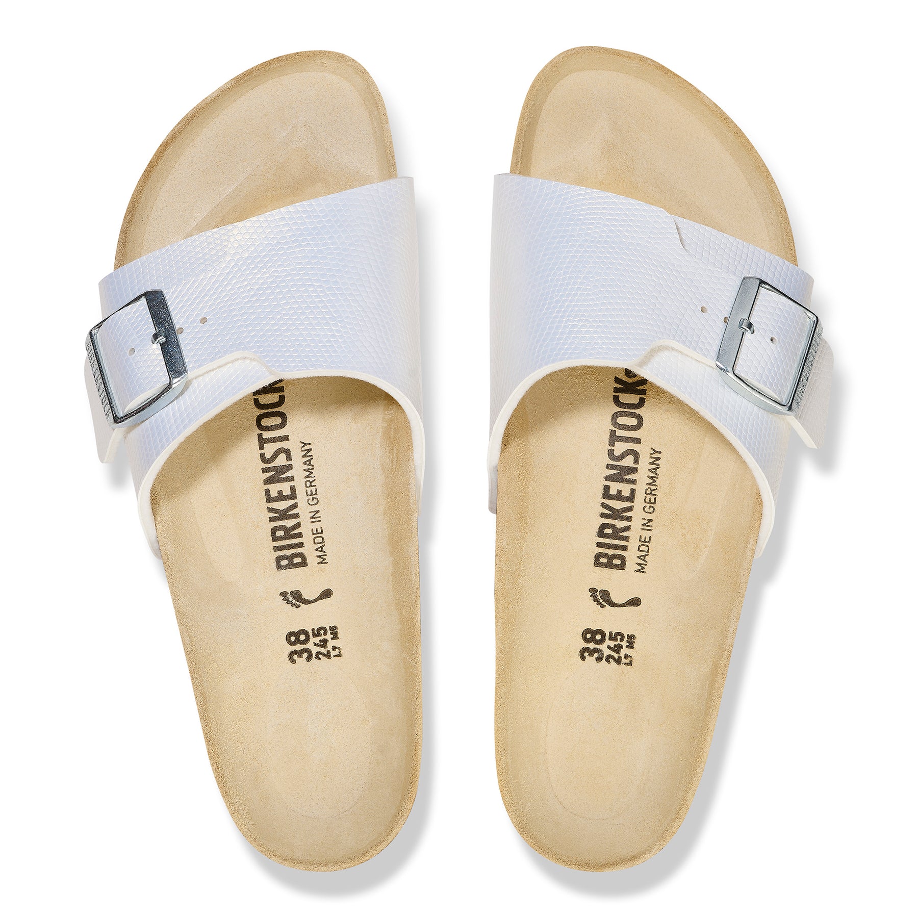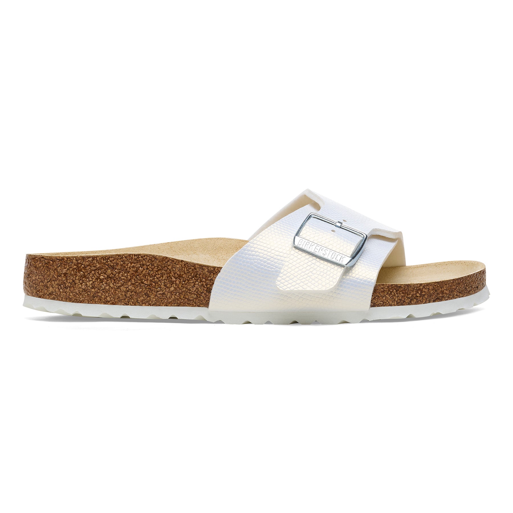 The design of the BIRKENSTOCK Catalina was inspired by the classic Madrid with a strap and metal buckle. The slightly wider strap lends this sandal a modern elegant appearance. This version comes in a shiny lizard design and exudes elegance and a touch of extravagance thanks to the iridescent metallic foil and the reptile skin look. Inspired by nature, no two shoes have the same look and feel. The upper is made from the skin-friendly, hard-wearing synthetic material Birko-Flor®, which has been embossed.