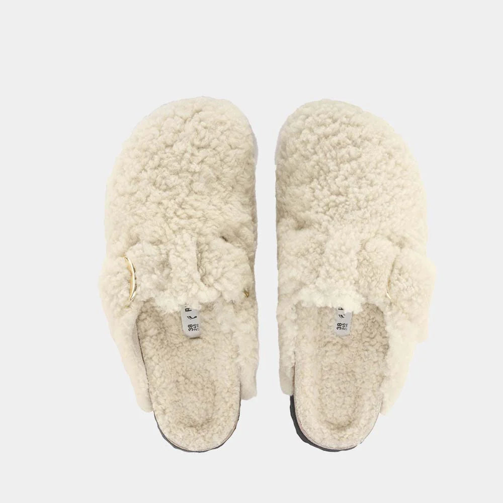 The Birkenstock brand accompanies you this season with models of   ultra comfortable and very trendy  women's shoes . The Birkenstock BOSTONS BB Shearling clogs in teddy eggshell and fur will match all your outfits. Discover the entire collection of   Birkenstock shoes on Ann Tuil.