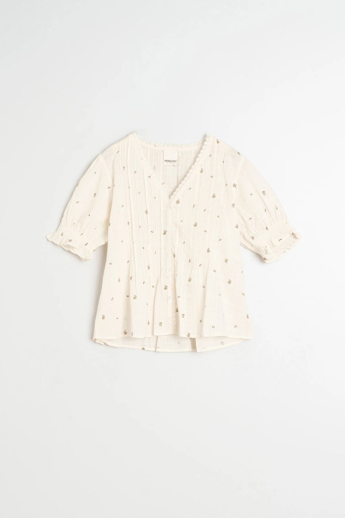 A shirt full of details. It has elastic balloon sleeves, a V-neck, and tucks at the waist for a super-feminine silhouette. It’s created with cotton dobby fabric that has a stamp-style floral motif.