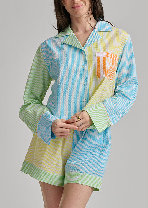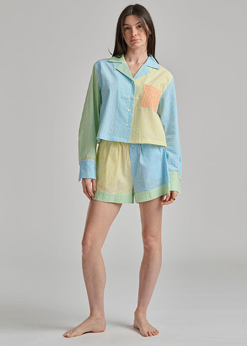 Lightweight seersucker fabric offers breathable comfort for warm nights and relaxed lounging. This mixed-pattern short set features a classic Ralph Lauren design with a coordinated top and shorts combination. Perfect for sleepwear or casual at-home wear, the textured weave provides gentle airflow while maintaining a polished, preppy aesthetic. Ideal for year-round comfort in any season.