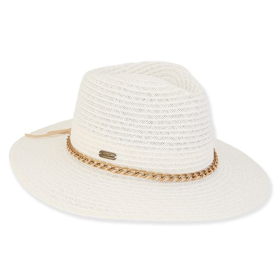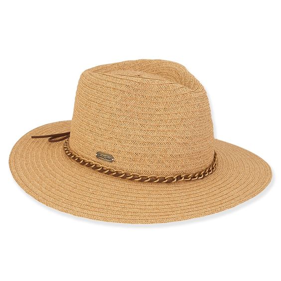 This Safari hat made of finely woven paper braid with metal chain trim is perfect for day dreaming at the beach.