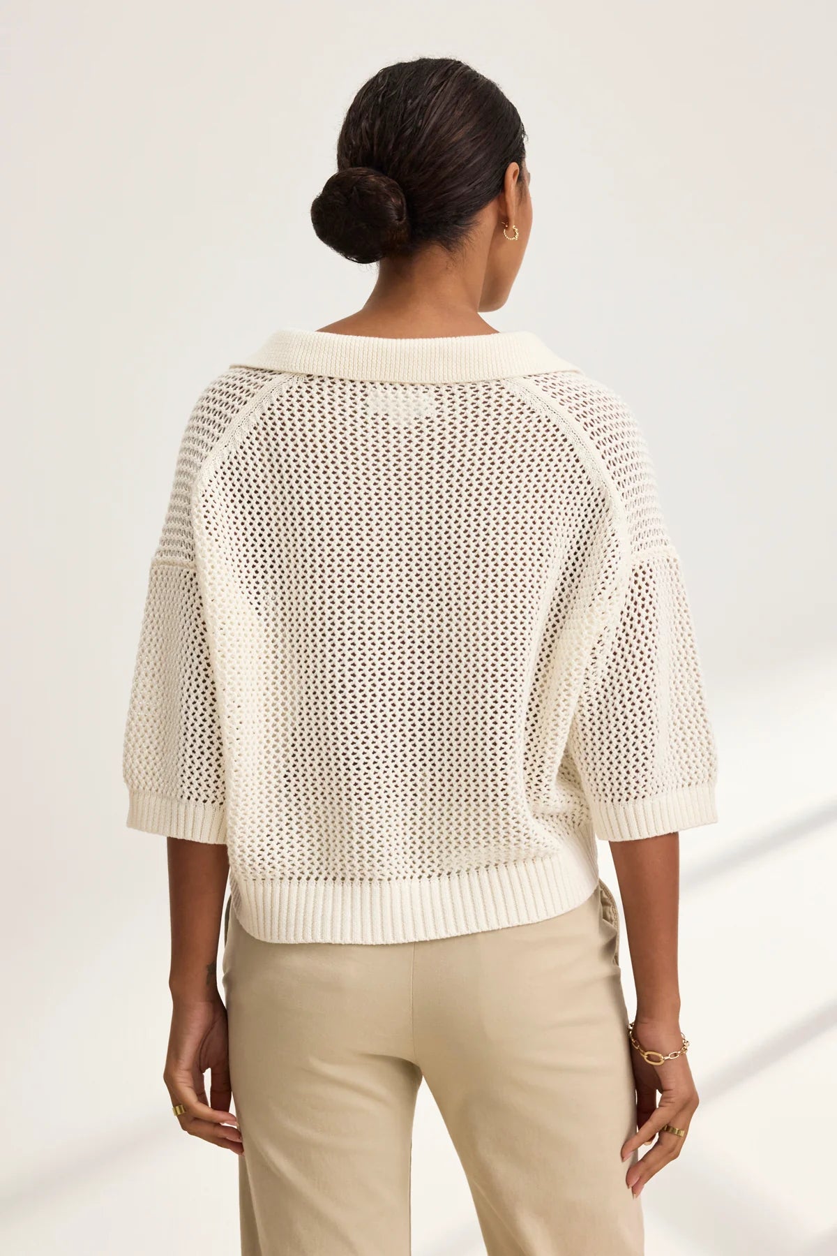 Crafted from a blend of cotton and cashmere in a breathable mesh knit, the York Sweater exudes casual charm. This polo-style sweater features ribbed detailing on the collar, placket, cuffs, and hemline, adding texture to its slightly cropped silhouette. With 3/4 sleeves and a relaxed fit, it offers effortless style for any occasion.
